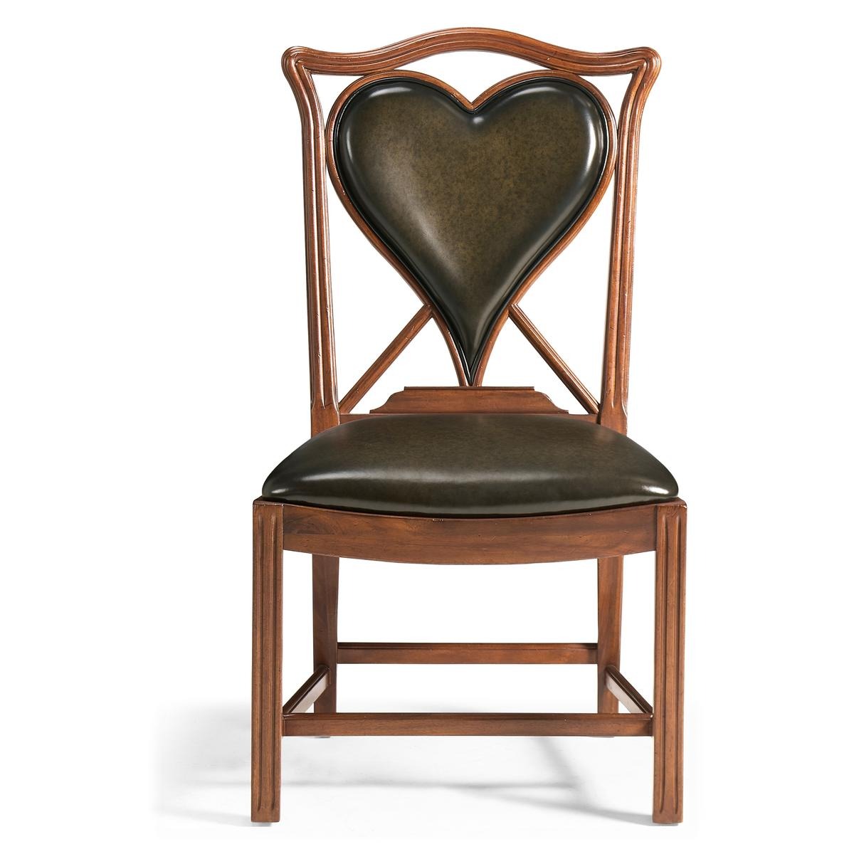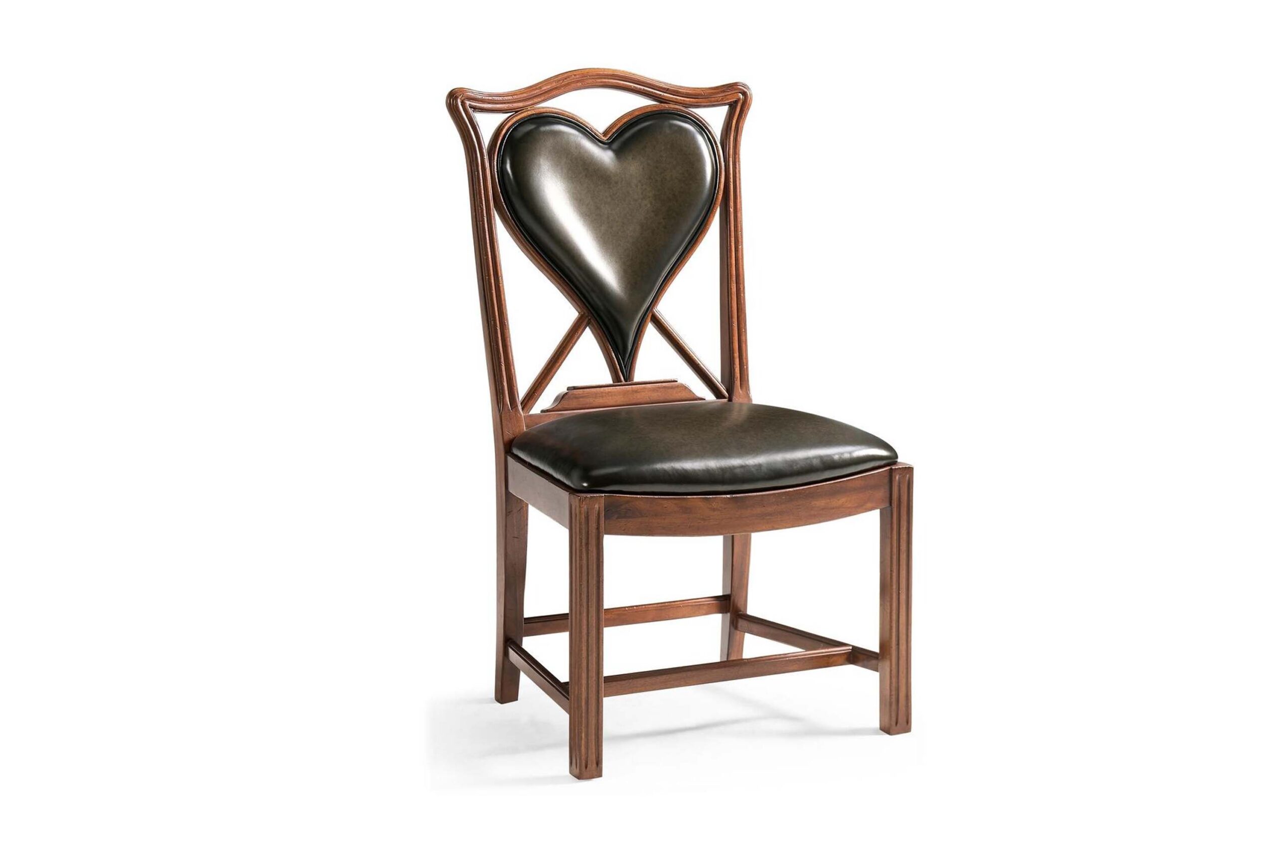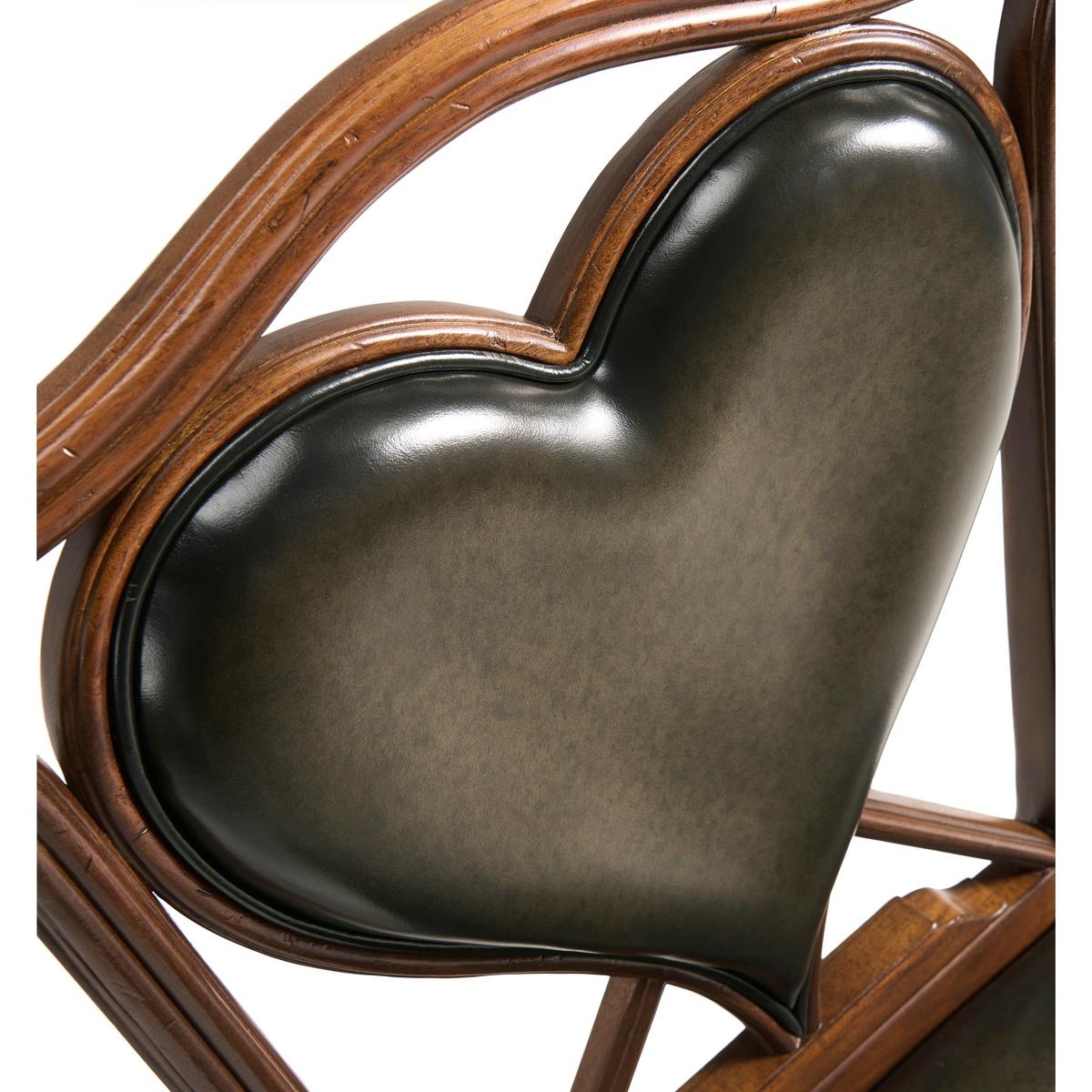 An unusual side chair constructed in walnut, based on an 18th century form with a shaped and serpentine top rail. The back features a central upholstered panel in English library green leather, formed in a heart-shaped outline and set within the surrounding frame. The chair is raised on reeded straight front legs, paired with raked rear legs that angle backward to support the structure. The absence of arms maintains a compact footprint, with proportions suited for table seating. The combination of shaped rail, upholstered panel, and leg detailing reflects a reinterpretation of period design adapted for card or game use. Measurements: 23″W x 24″D x 42″H