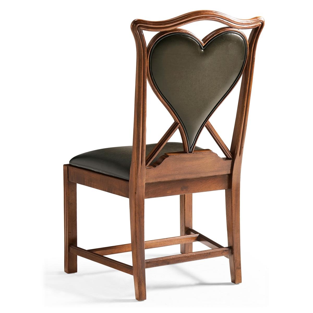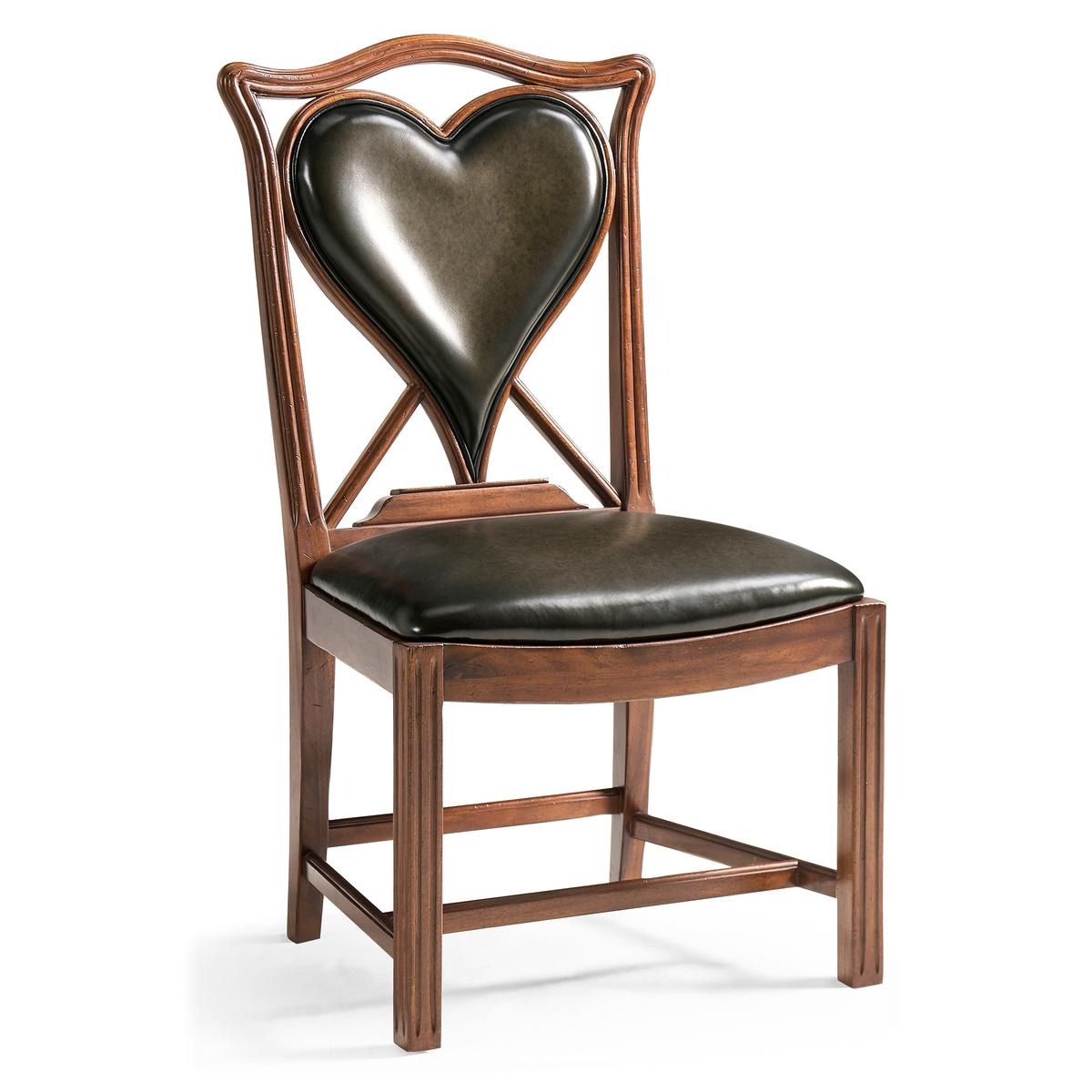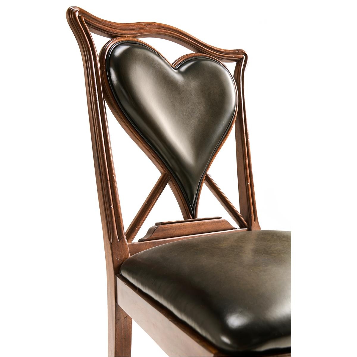 An unusual side chair constructed in walnut, based on an 18th century form with a shaped and serpentine top rail. The back features a central upholstered panel in English library green leather, formed in a heart-shaped outline and set within the surrounding frame. The chair is raised on reeded straight front legs, paired with raked rear legs that angle backward to support the structure. The absence of arms maintains a compact footprint, with proportions suited for table seating. The combination of shaped rail, upholstered panel, and leg detailing reflects a reinterpretation of period design adapted for card or game use. Measurements: 23″W x 24″D x 42″H