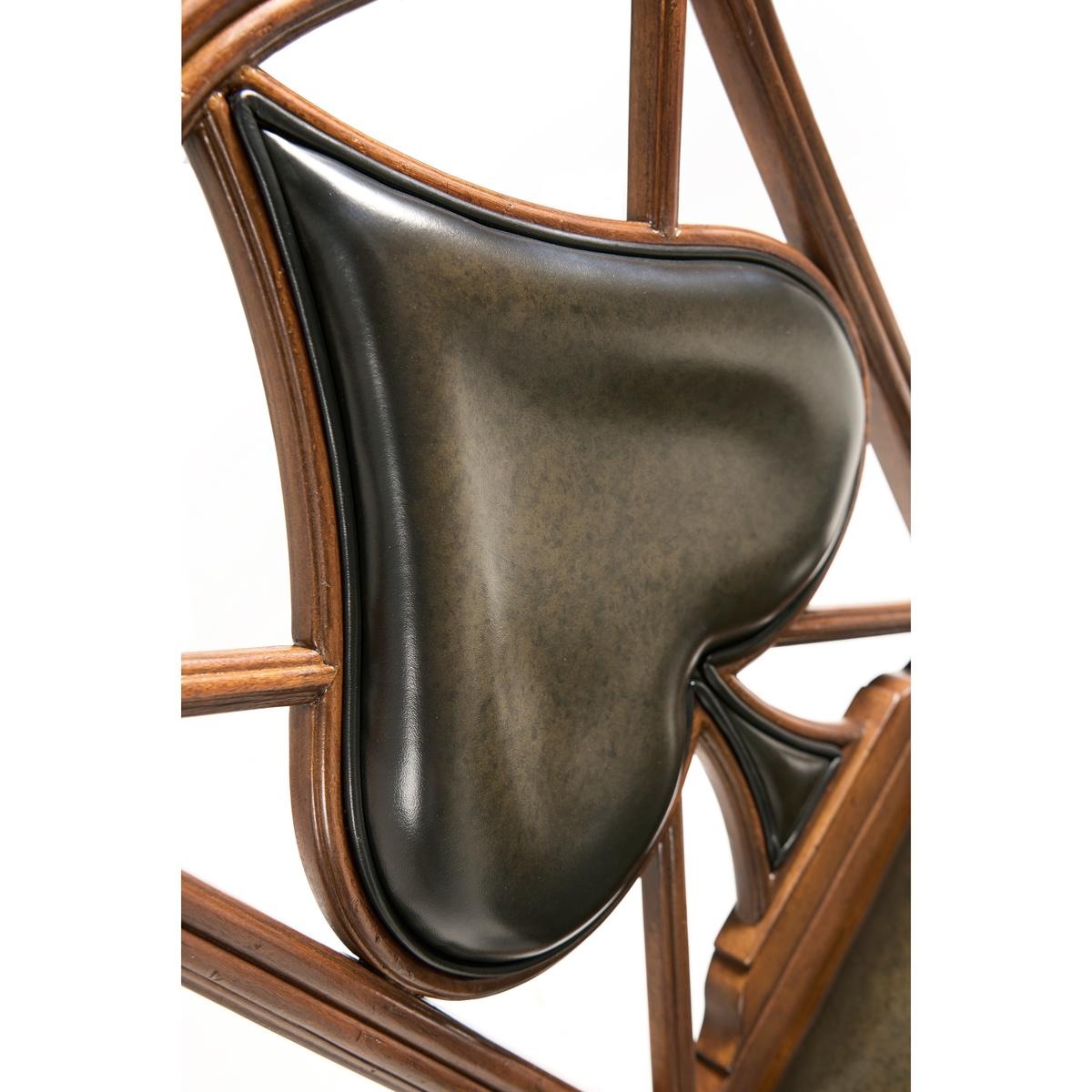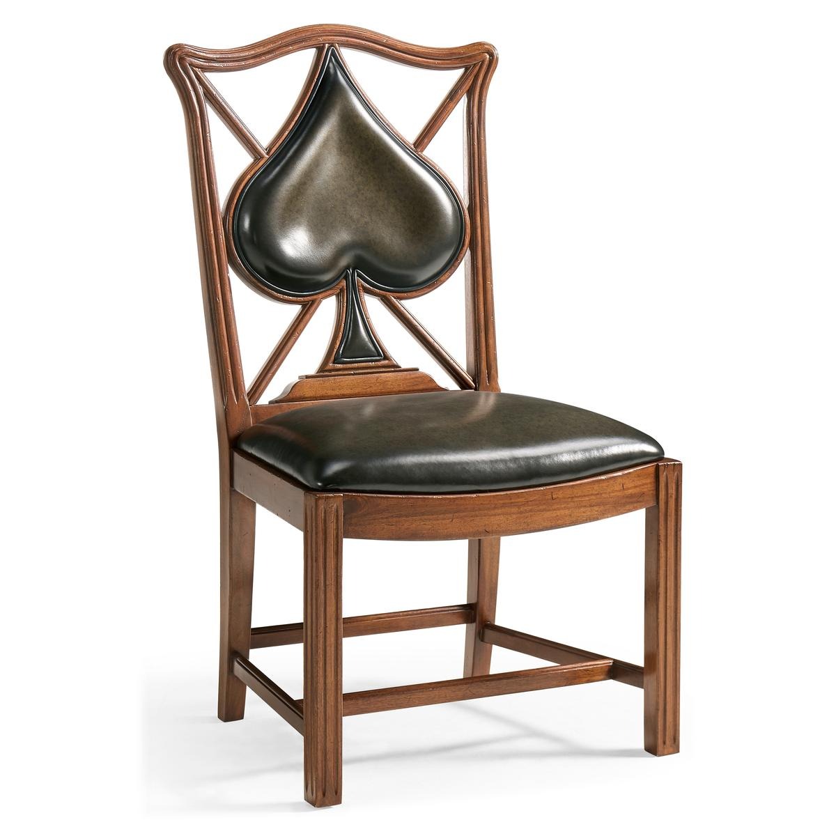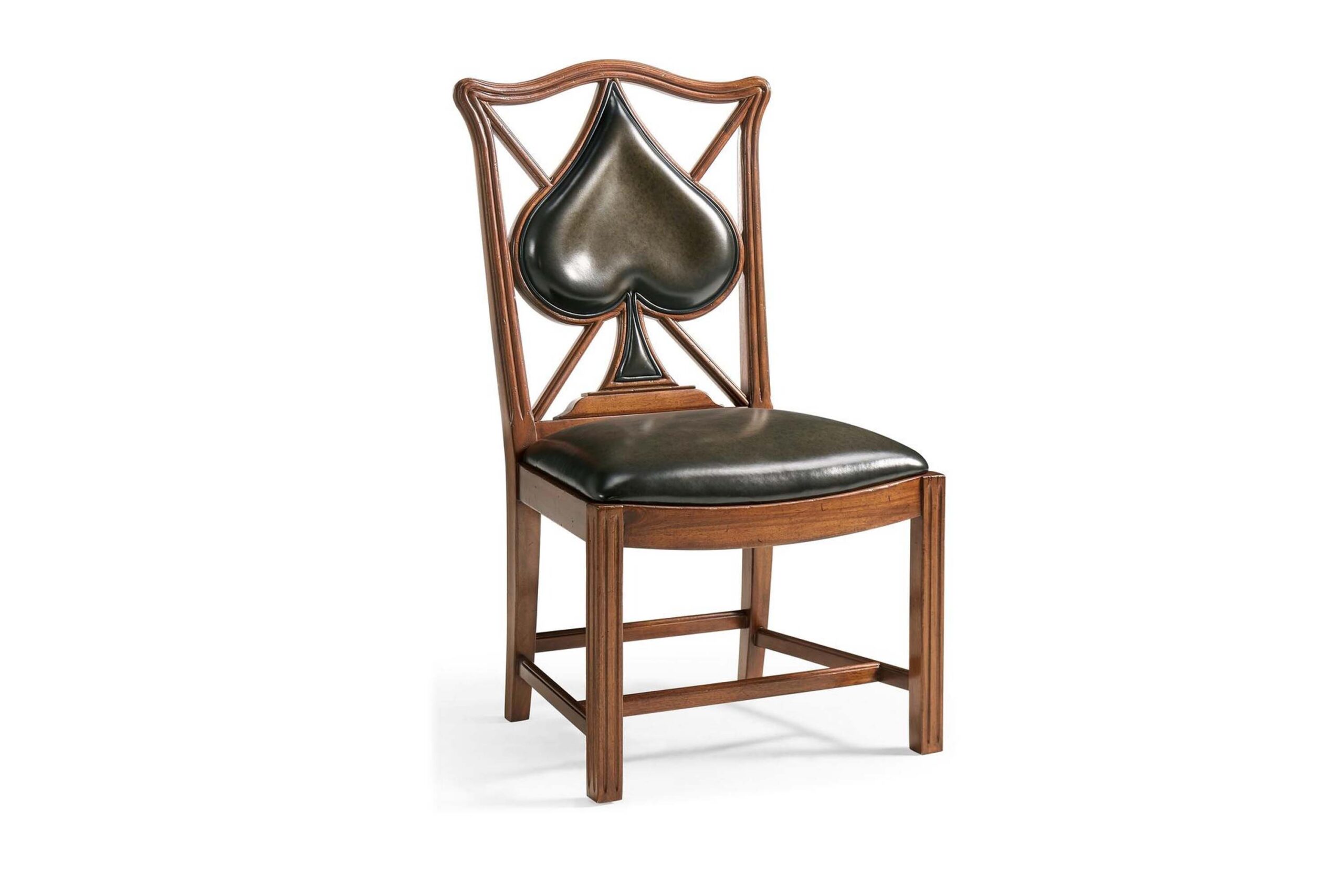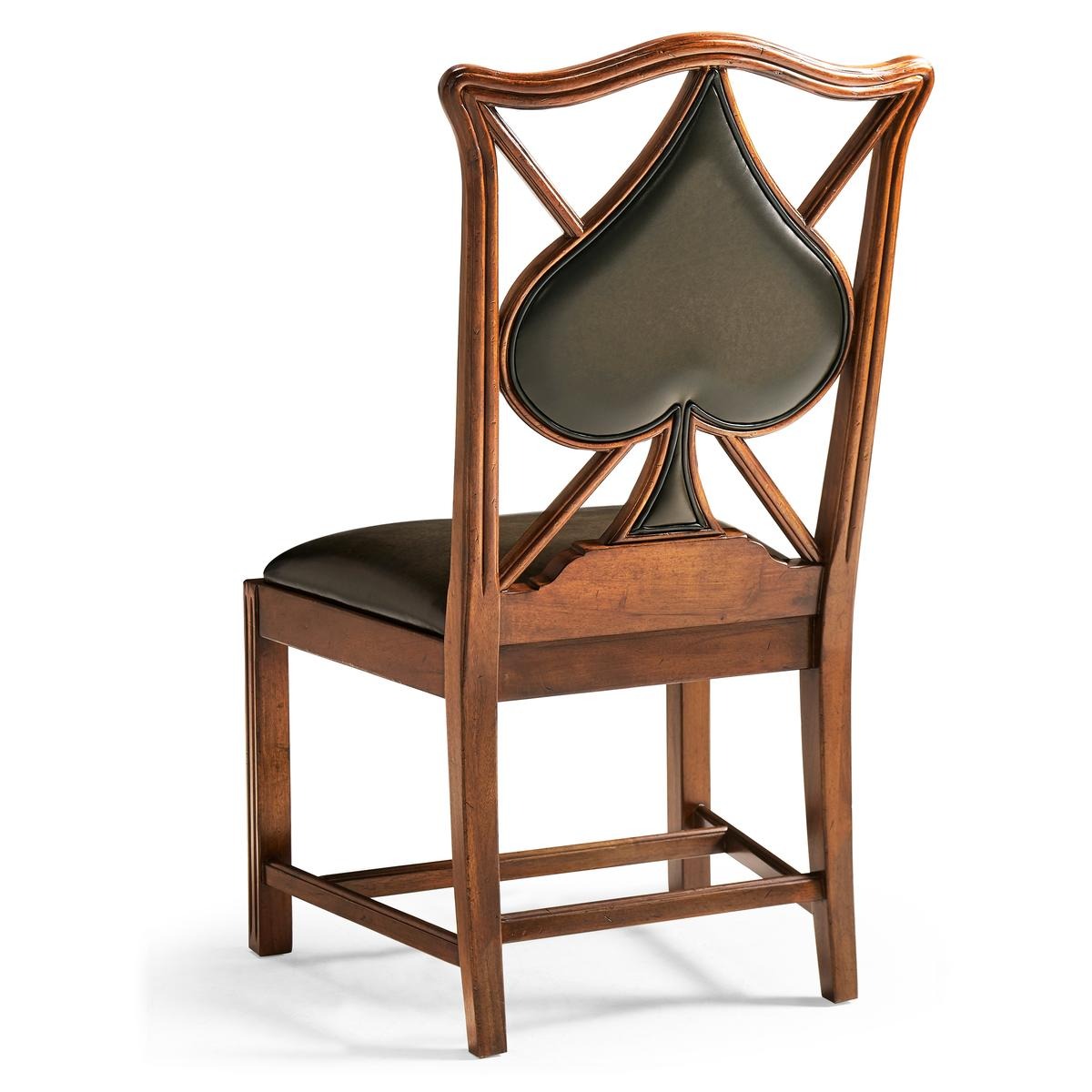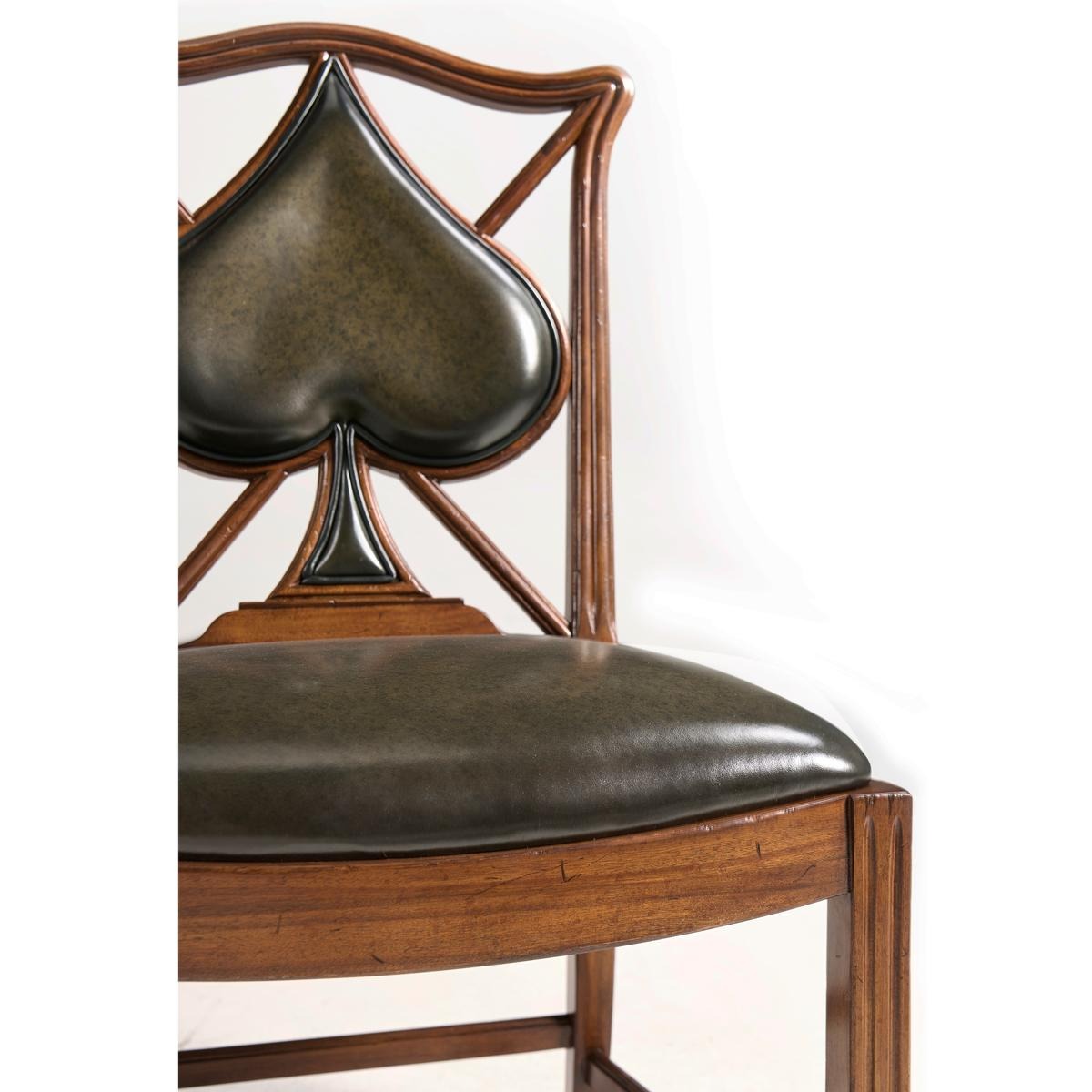 An unusual side chair constructed in walnut, based on an 18th century form with a shaped and serpentine top rail. The back features a central upholstered panel in English library green leather, formed in a spade-shaped outline and set within the surrounding frame. The arms sweep outward from the back, transitioning into the seat rail with a continuous flow. The chair stands on reeded straight front legs, paired with raked rear legs that angle backward for support and balance. The proportions are scaled for table seating, making it suitable for use in card or game settings. The combination of shaped rail, upholstered panel, and leg detailing reflects a reinterpretation of period design adapted for functional seating. Measurements: 23″W x 24″D x 42″H