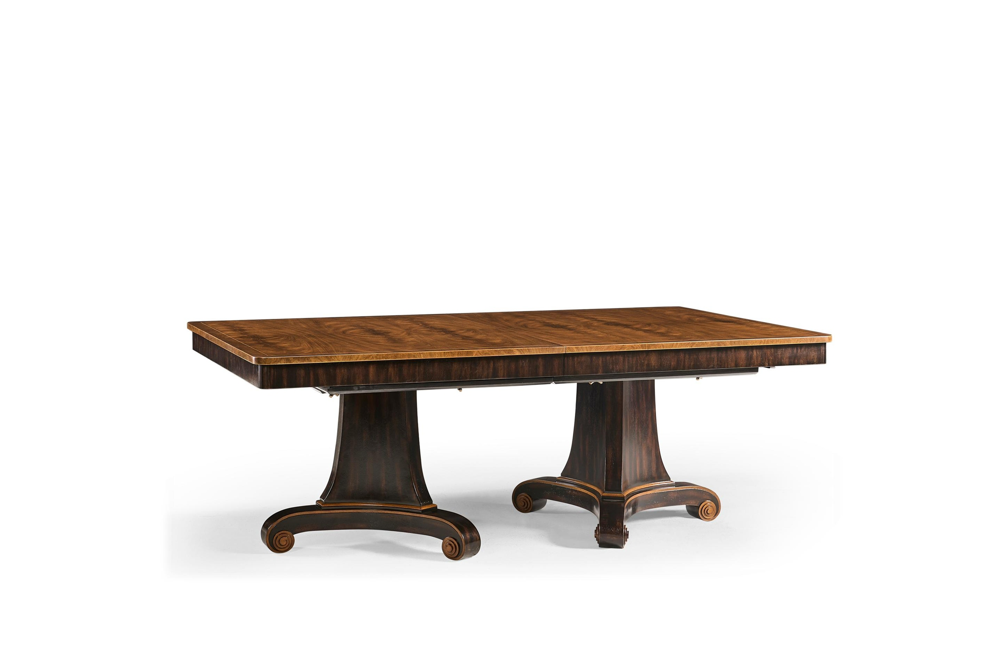 Experience the elegance of tradition with the beautifully crafted Rosette dining table, designed to be the focal point of your dining space. The table showcases exquisite crotch walnut and Cerajeria veneers, creating a rich and luxurious surface that exudes timeless charm. Its dark walnut pedestal bases are expertly highlighted with Cerajeria veneers complementing the scrolled feet for a refined and cohesive look. Perfect for hosting large gatherings, this table extends to 132 inches with the addition of two 24-inch leaves, offering both style and functionality for your dining needs.