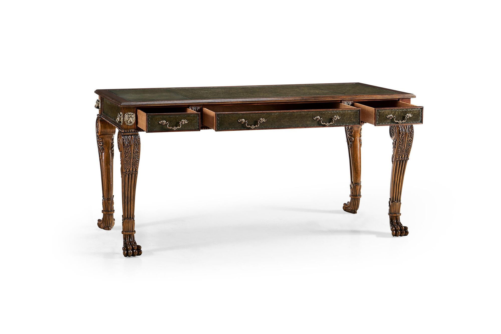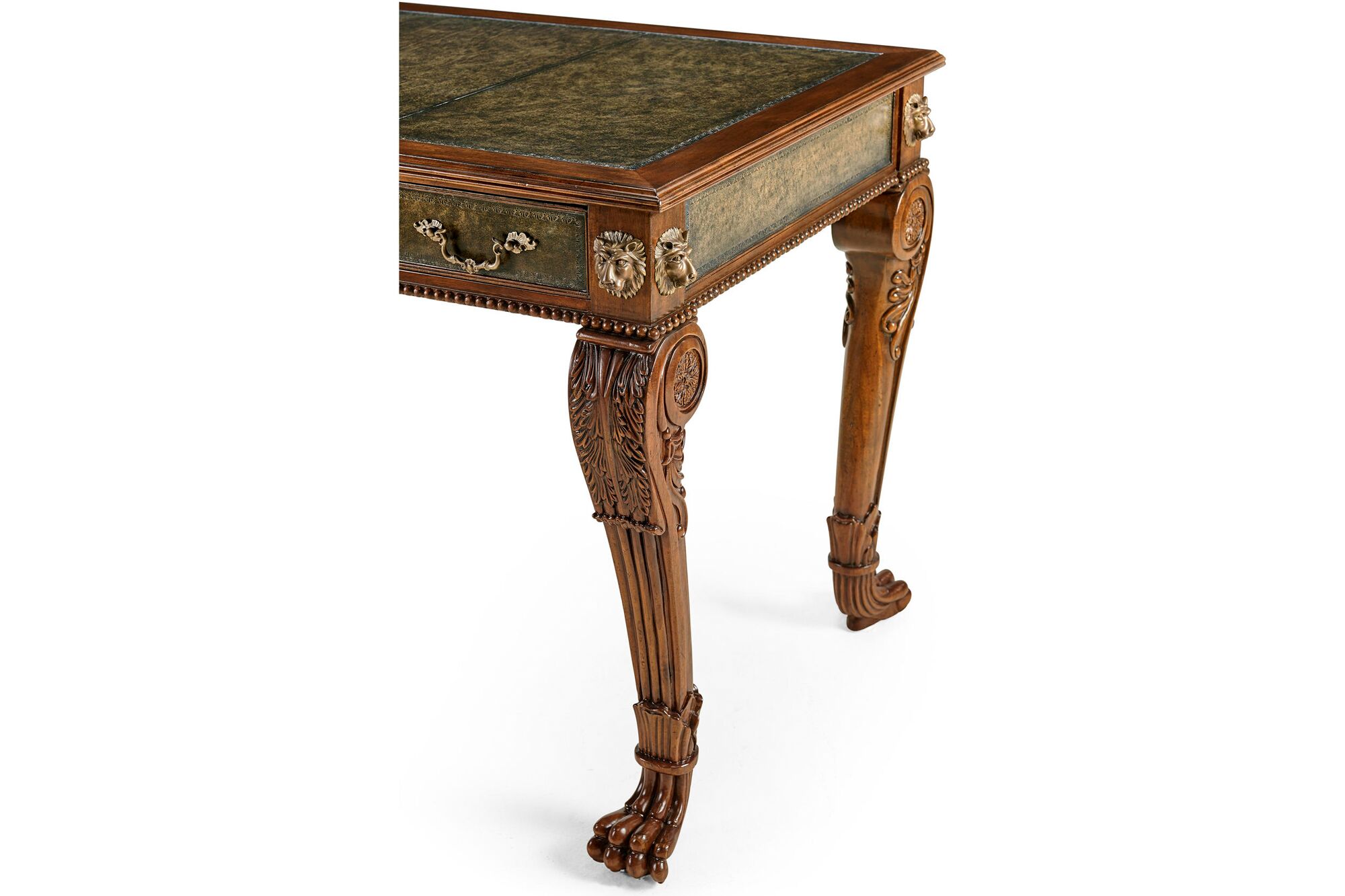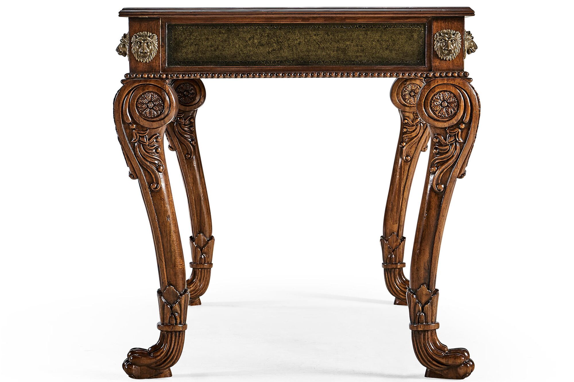 Imposing and finely carved walnut writing table after an Italian original of c.1800, with inset green leather panels to the surface and three drawers, brass lions head details and shallow carved volute legs terminating in lions paw feet.