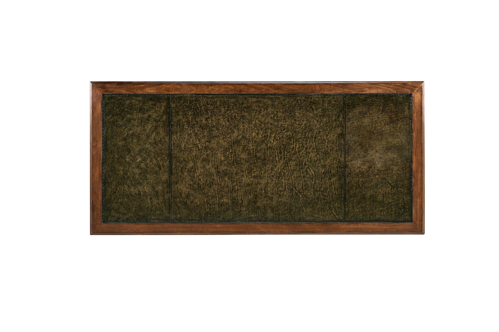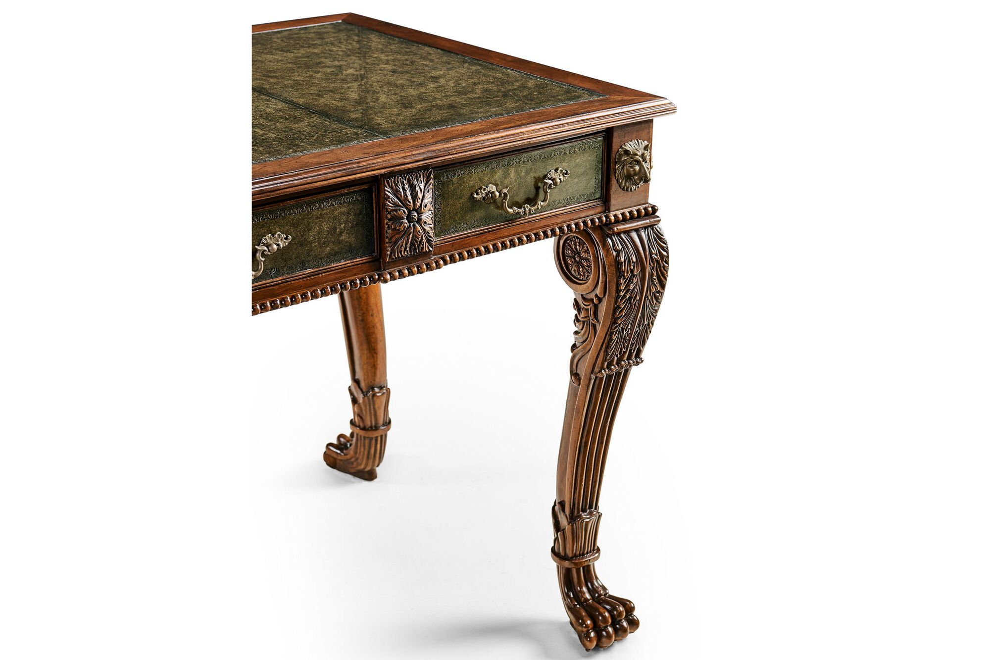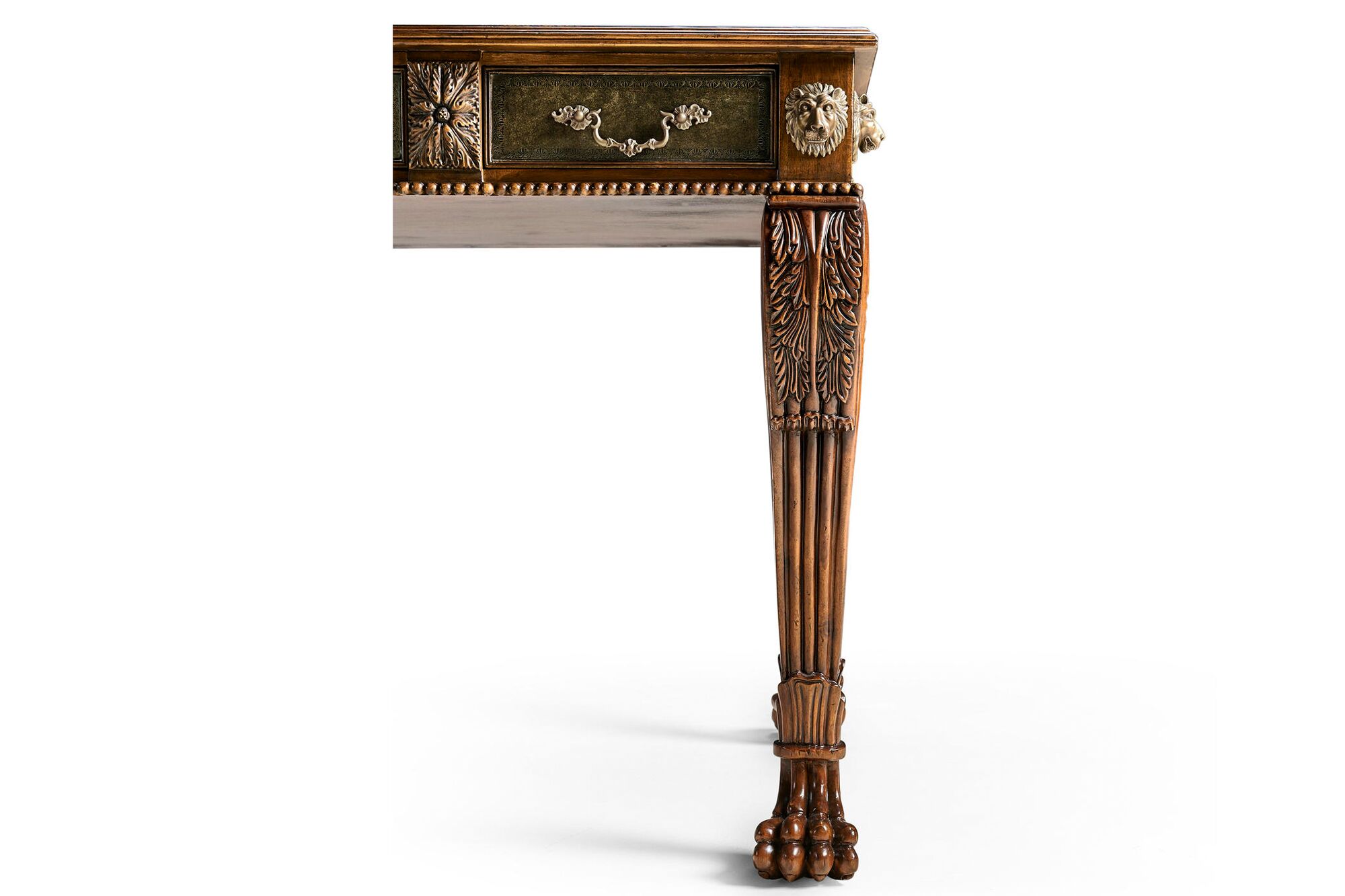 Imposing and finely carved walnut writing table after an Italian original of c.1800, with inset green leather panels to the surface and three drawers, brass lions head details and shallow carved volute legs terminating in lions paw feet.