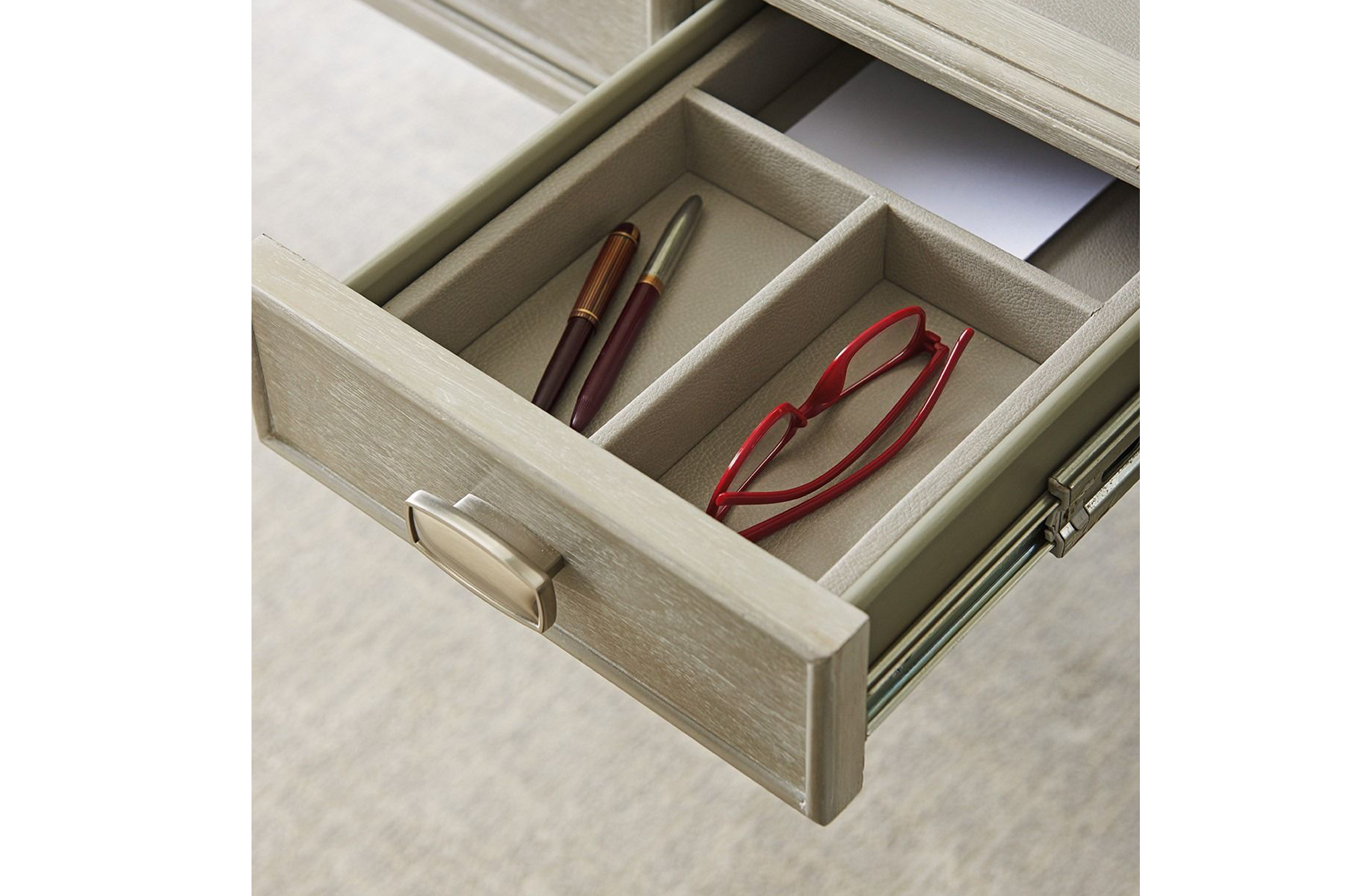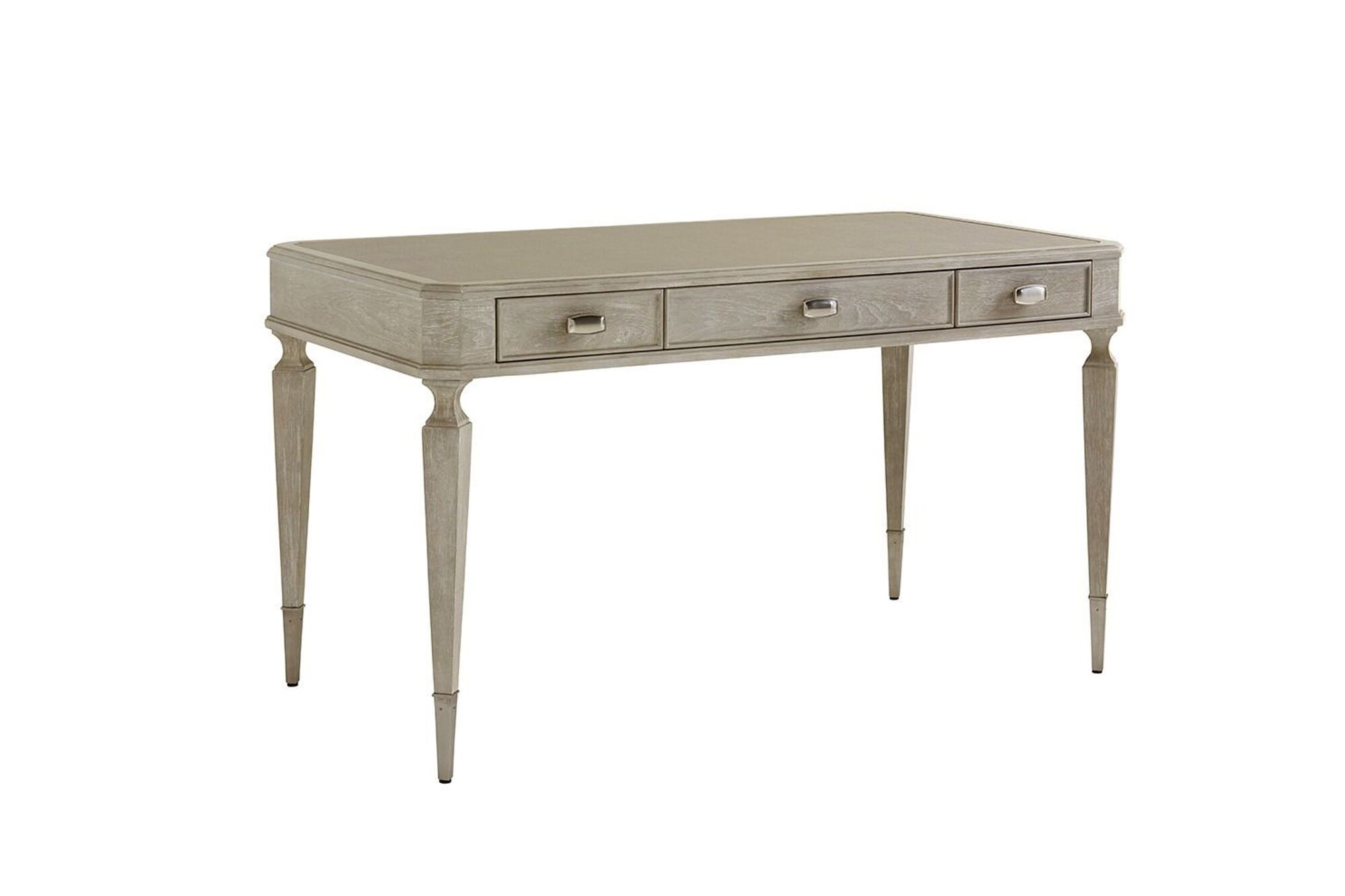This writing desk features a solid wood frame and three storage drawers with metal hardware. The desk is supported by tapered legs finished with brushed-nickel metal ferrules. The writing surface is finished in coordinated gray faux leather, providing a defined work area. The drawer configuration supports the storage of small office or personal items. The desk is intended for use in a home office or bedroom workspace where a fixed writing surface and drawer storage are required.